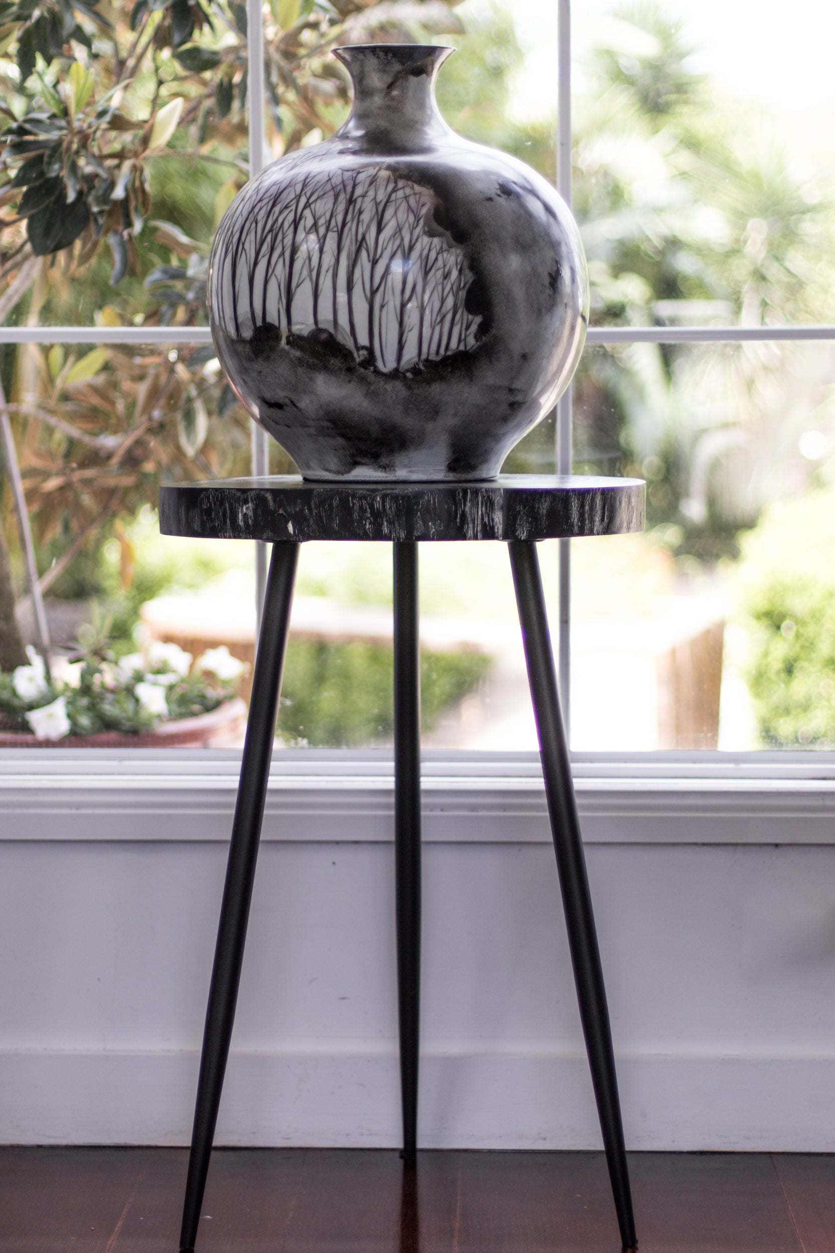 High Black Wood Slab Side Table With Metal Legs