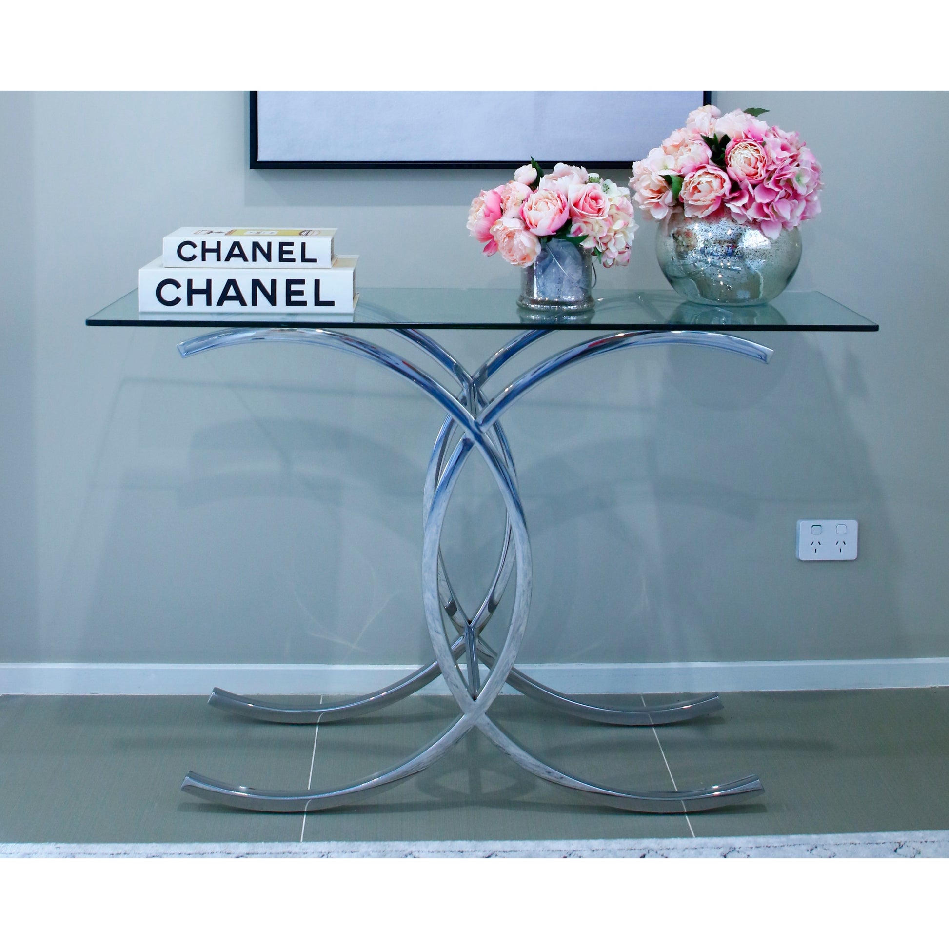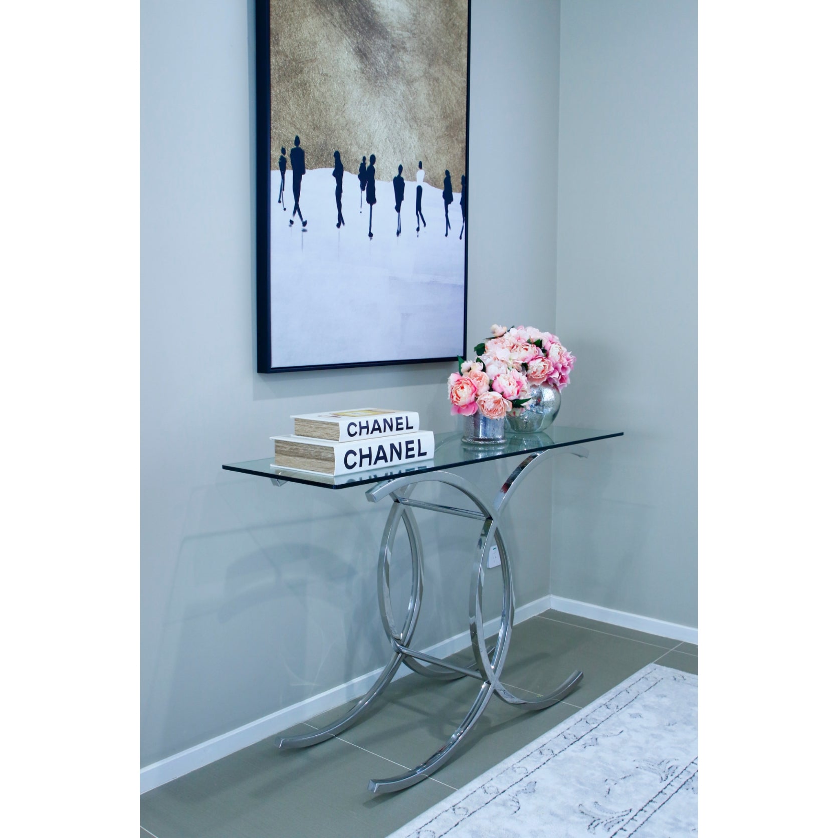 Corry Mirror Polished Stainless Steel Console with Clear Glass Top