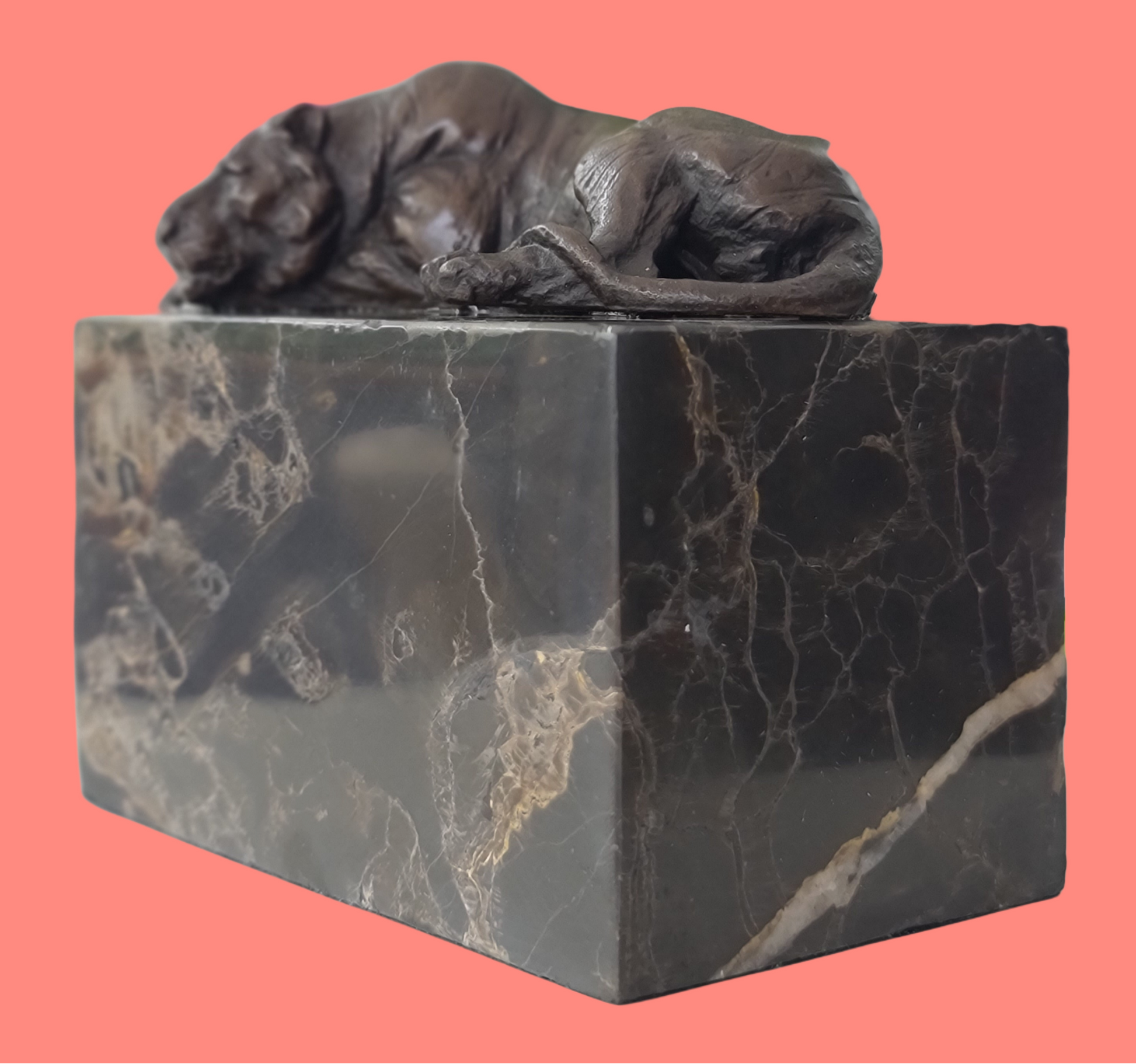 laying Tiger Bronze Sculpture on Marble Base